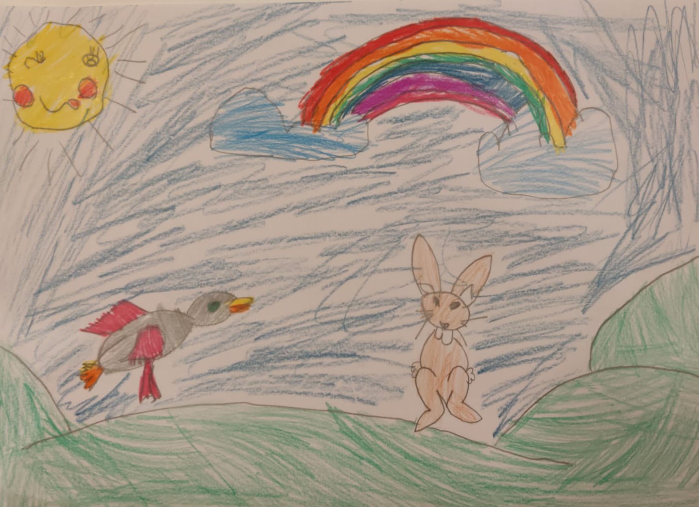 Hace tiempo que no dibujaba tantos soles ,tantos arcoiris y tantos árboles ( con nido mamá, al árbol le gusta tener vecinos).